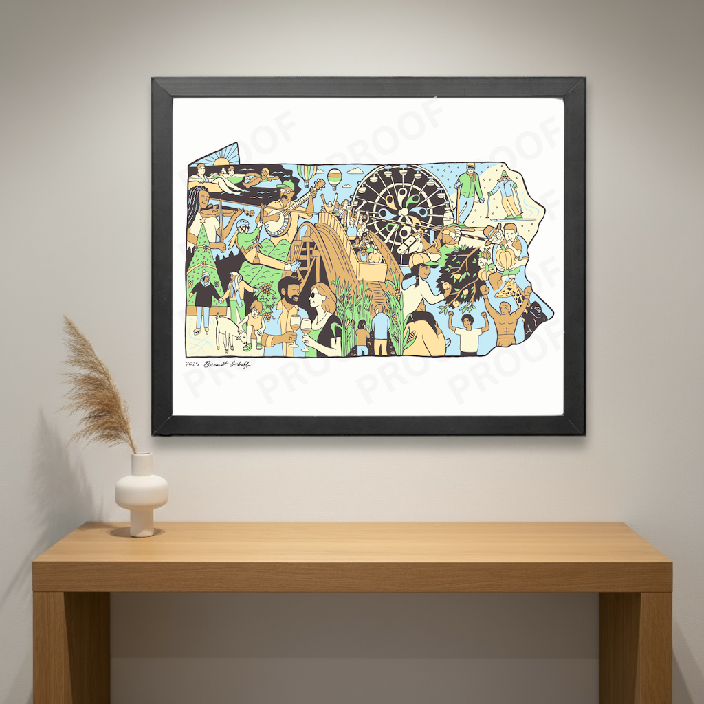Our exclusive PA Natural Wonders artwork — hand-drawn by an artist in Lancaster, PA — as a framed print. View size and frame color options